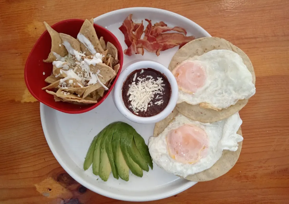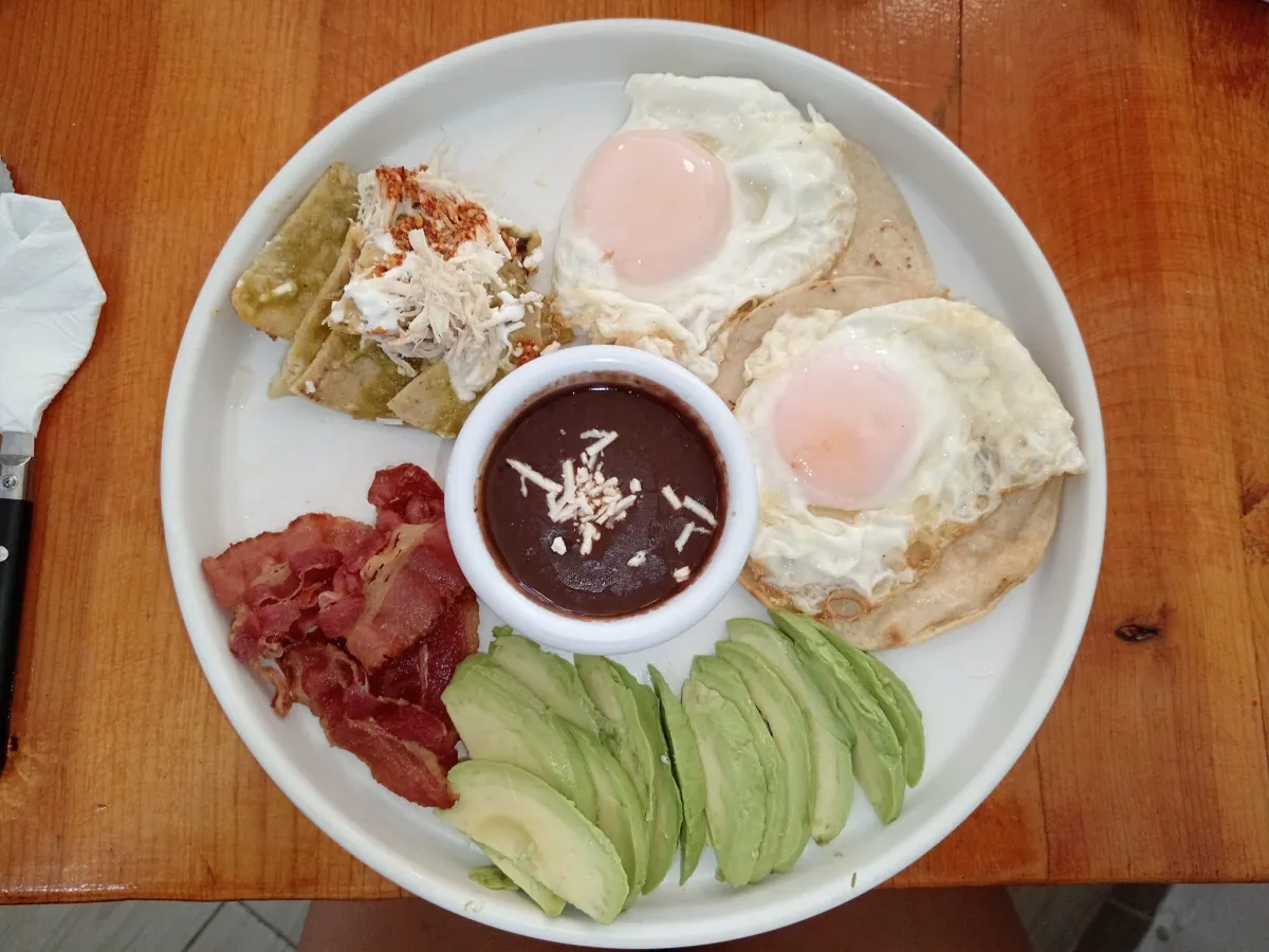 Two fried eggs served over a crispy tortilla and accompanied by chilaquiles, beans, bacon, and fresh avocado. A breakfast made for those who want it all — bold, hearty, and full of flavor. It’s the plate that says: “Today, you rule the morning.”